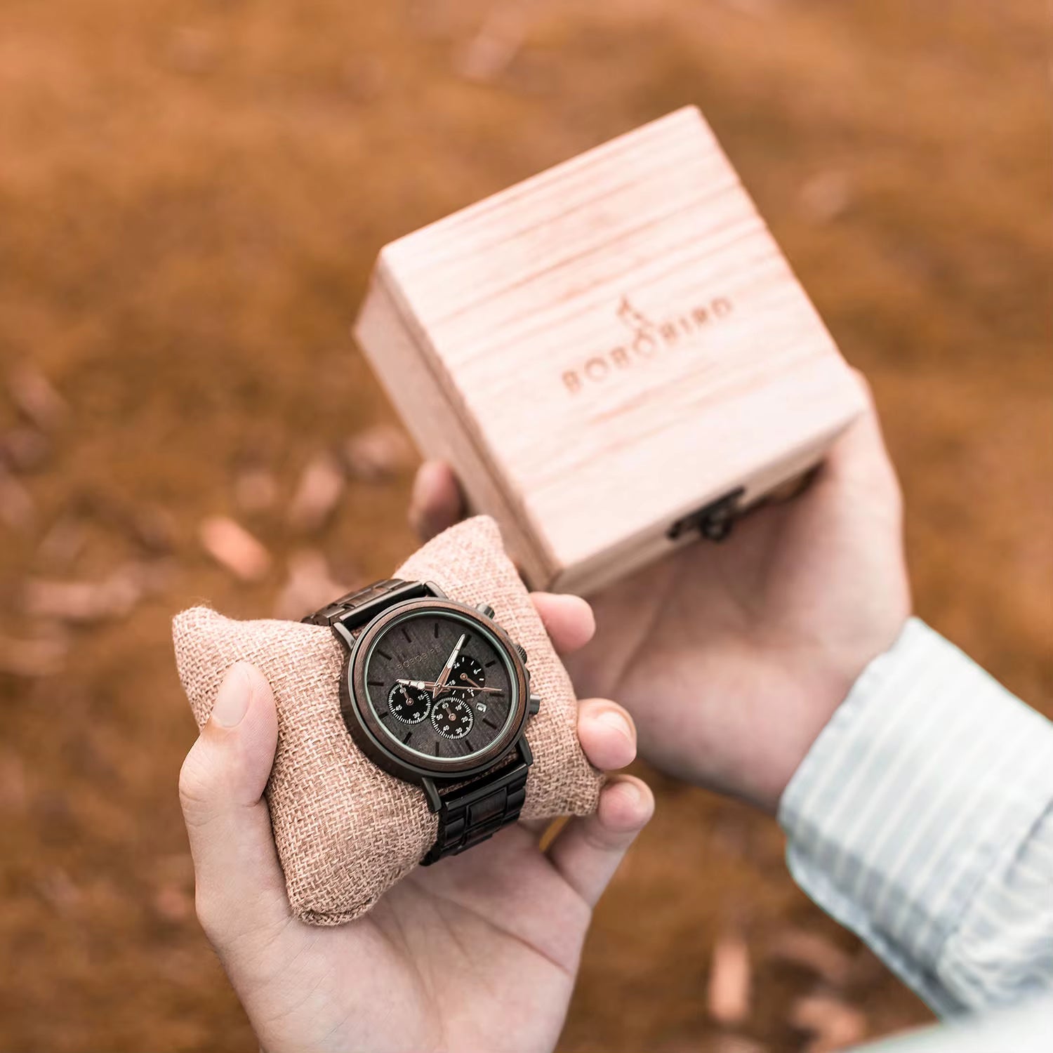 🔹 Gotowy Pomysł na Wyjątkowy Prezent Zegarek Bobo Bird dostarczany jest w eleganckim, firmowym pudełku, idealnym na prezent. W zestawie znajduje się również specjalne narzędzie, które pozwala na samodzielne i łatwe skrócenie bransolety w celu idealnego dopasowania do nadgarstka.